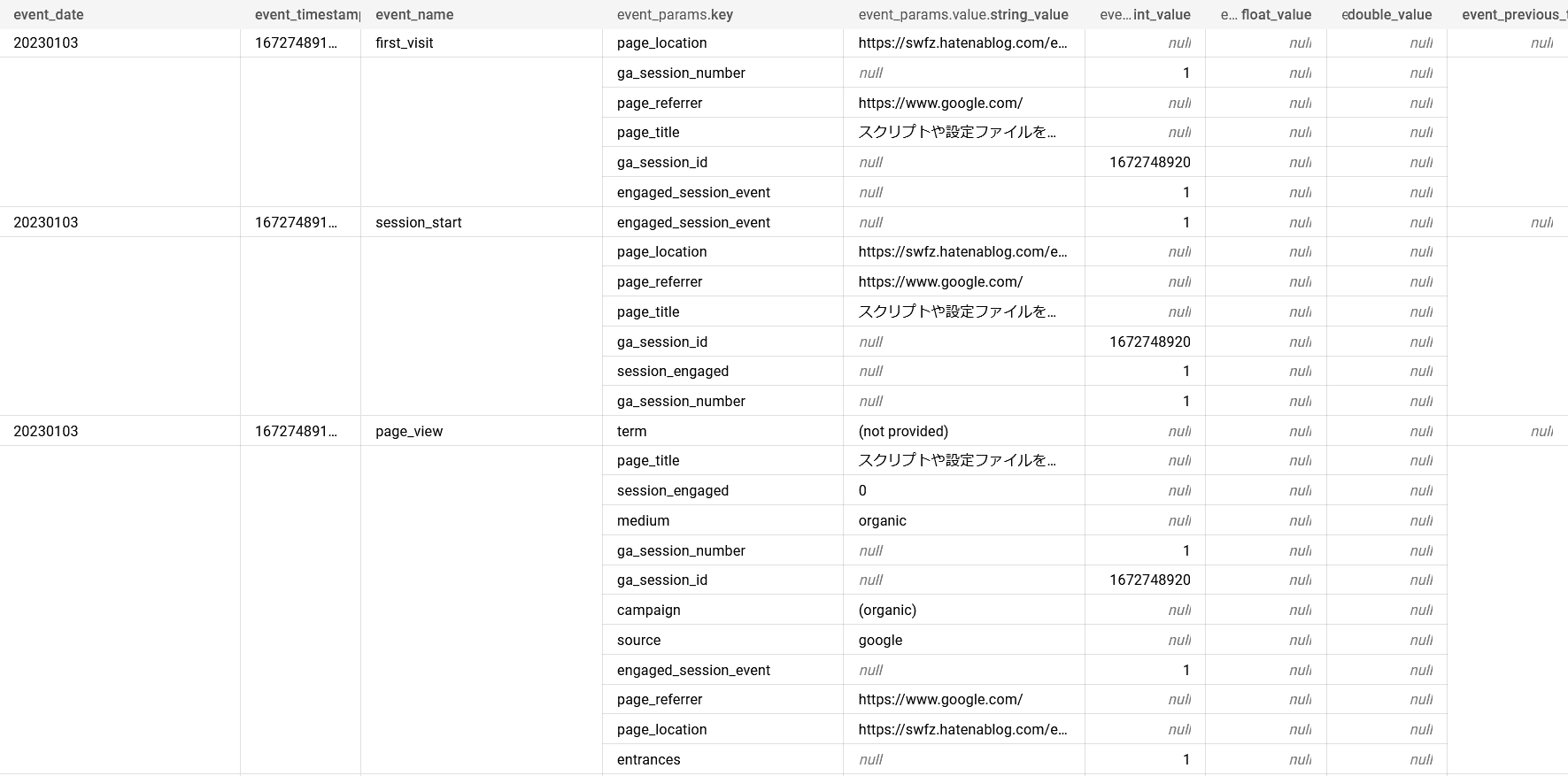FROM `project.dataset.events_20230103`各種valueはevent_params.value.string_value, event_params.value.int_value… といったようにevent_params.keyによって値の型が異なるのでどのカラムにデータが格納されるかが変わる