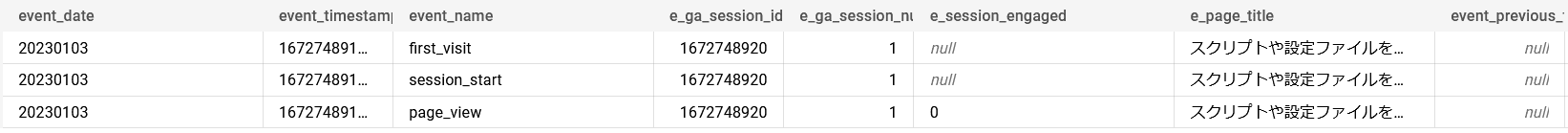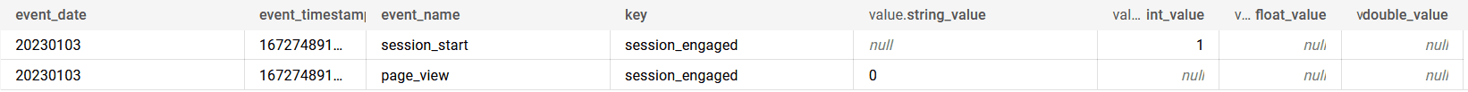 しかし、いくつか確認してみたところsession_engagedの場合、event_nameの値によって格納されるカラム(int_value,string_value)が違うようだった