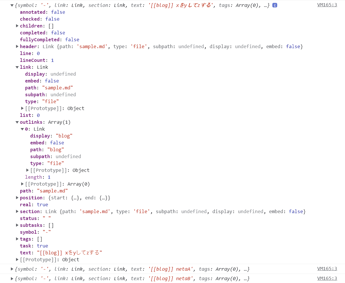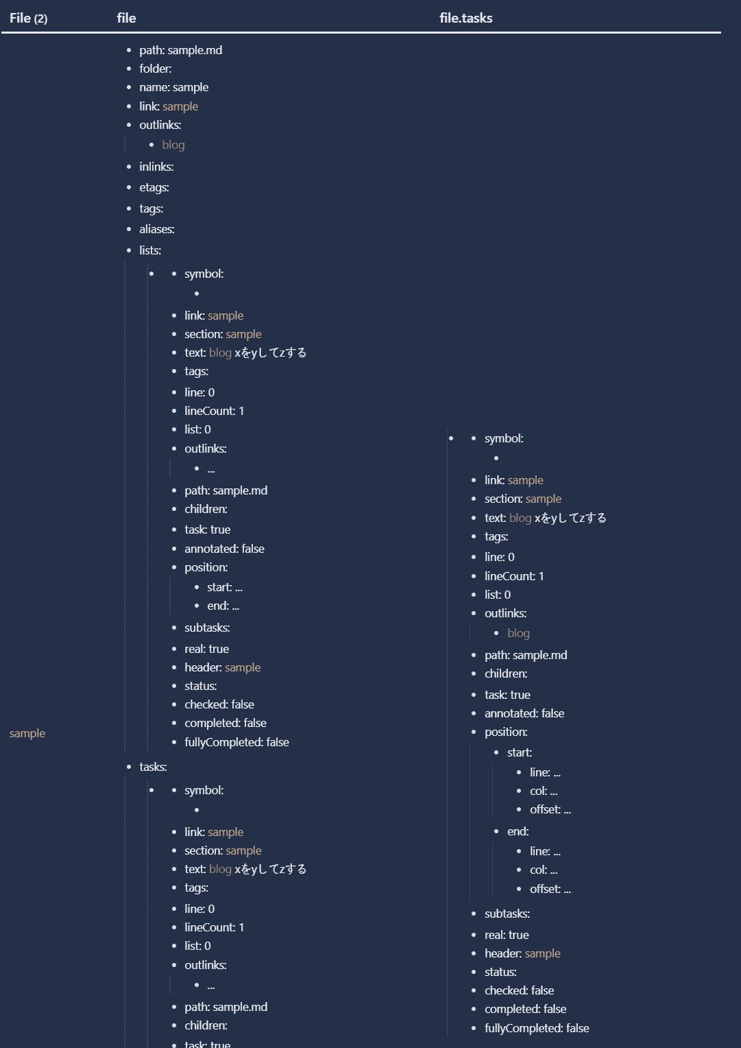 もしくは、dataviewjsのコードブロックのJavaScript中にconsole.log()を仕込み、DeveloperToolsでオブジェクトの中身を覗くことができる