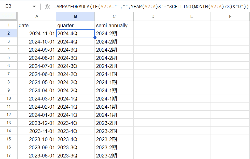 Spreadsheetで日付からQ単位、半期単位の文字列を生成する2024-10-02SpreadsheetQごとや半期ごとに集計するみたいな際、日付情報からその日のQや上期、下期みたいなのを出力させる Qごと =ARRAYFORMULA(IF(A2:A="","",YEAR(A2:A)&"-"&CEILING(MONTH(A2:A)/3)&"Q")) 半期ごと =ARRAYFORMULA(IF(A2:A="","",YEAR(A2:A)&"-"&CEILING(MONTH(A2:A)/6)&"期")) 1が上期、2が下期 イメージ