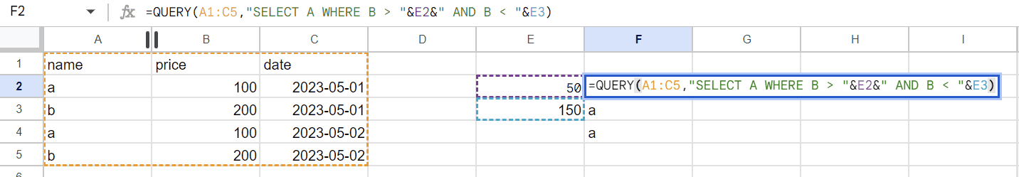 =QUERY(A1:C5,"SELECT A WHERE B > "&E2&" AND B < "&E3)条件が最後に来る場合は&でセル指定するだけで良い