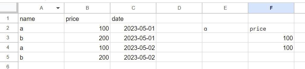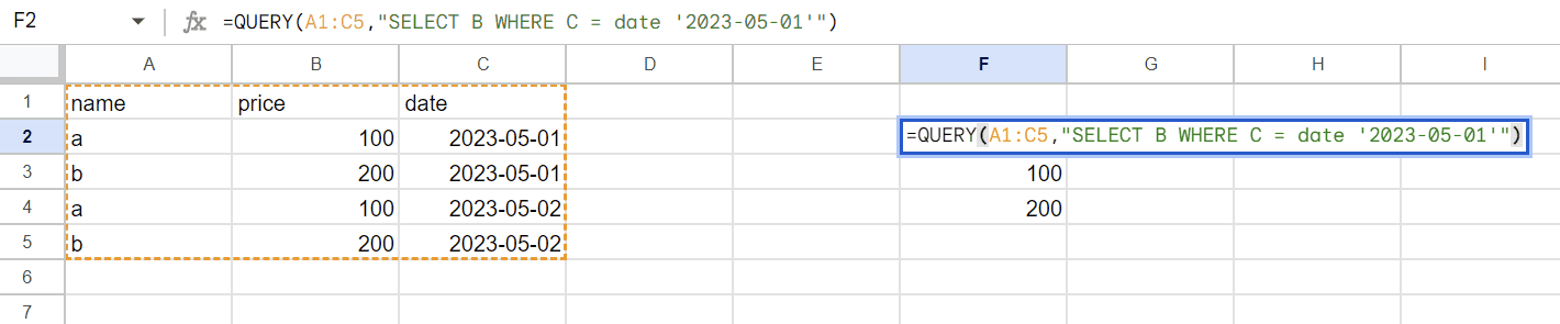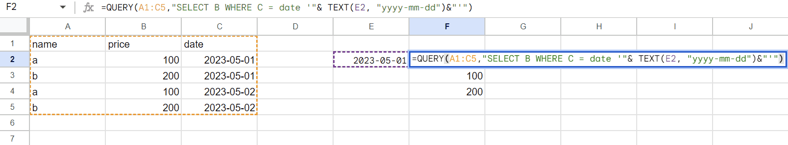 =QUERY(A1:C5,"SELECT B WHERE C = date '2023-05-01'")日付のセルを指定してQUERYで使う