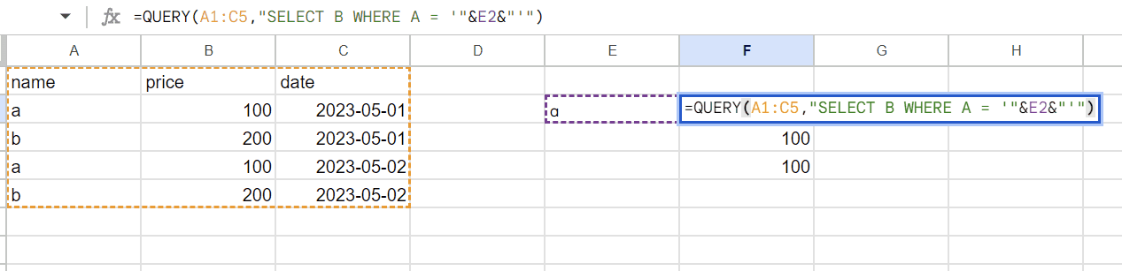 =QUERY(A1:C5,"SELECT B WHERE A = '"&E2&"'")固定($)も使える